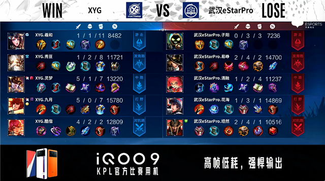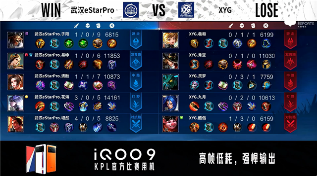 双方常规开局。3分36秒XYG拿下暴君,武汉eStar拿下主宰。4分07秒武汉eStar暴君处击杀刘邦拿到一血。5分12秒武汉eStar中路下河道击杀蒙恬。5分52秒武汉eStar摧毁敌方发育路二塔。7分37秒武汉eStar摧毁敌方对抗路二塔。8分02秒武汉eStar拿下暴君。9分23秒武汉eStar摧毁敌方中路外塔。9分52秒野区团战武汉eStar击杀蒙恬。10分04秒武汉eStar摧毁敌方中路二塔。10分24秒武汉eStar拿下暗影主宰。11分24秒中路团战双方2换2,武汉eStar摧毁敌方发育路、中路高地塔。12分25秒武汉eStar拿下暗影暴君。13分24秒武汉eStar摧毁敌方对抗路高地塔。14分05秒高地团战武汉eStar打出1换5。14分15秒武汉eStar摧毁敌方水晶拿下比赛。