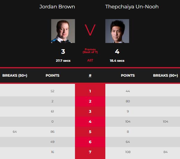 第四局,塔猜亚单杆轰出104分直接零封对手2-2战平布朗。第五局,布朗单杆轰出64分之后以86:8拿下此局比赛的胜利从而以3-2领先塔猜亚率先拿到赛点。第六局,塔猜亚64:49拿下此局比赛的胜利以3-3战平乔丹布朗。第七局,塔猜亚单杆轰出84分直接拿下此局比赛的胜利从而4-3绝杀布朗晋级。