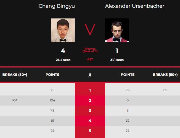 在首局比赛中,尤森巴赫率先打出不错的竞技状态,他凭借单杆65分的出色表现以79:0零封常冰玉直接取得1-0的领先。第二局,常冰玉成功找回状态,单杆轰出104分零封对手并以1-1战平尤森巴赫回到同一起点。第三局,常冰玉通过多次上手的机会以79:8拿下此局从而以2-1反超尤森巴赫取得领先。