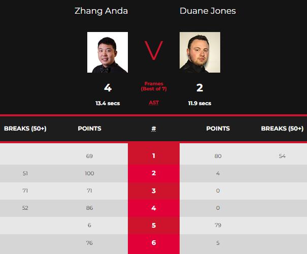 第三局,张安达手感火热,单杆轰出71分零封琼斯顺利取得2-1的领先。第四局,张安达单杆轰出52分后以86:0拿下此局比赛的胜利3-1领先琼斯率先拿到自己在本场比赛中的赛点。第五局,琼斯79:6拿下此局2-3落后张安达。第六局,张安达76:5拿下此局比赛的胜利从而4-2淘汰琼斯顺利晋级。