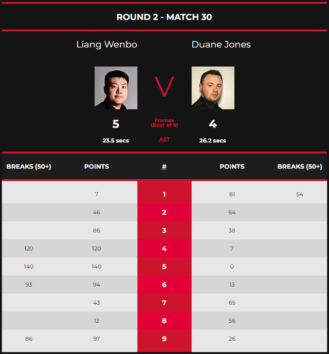 第一局连续的防守,梁文博中袋红球上手,不过也只是拿到了7分,琼斯8分反超进入防守。琼斯随后62-7打丢黄色球失误,梁文博再漏机会,琼斯上手超分,锁定了本局的胜局。第二局,梁文博多次打到37分,琼斯单杆18分再次中断,而在其44分又失误,梁文博上手46-44打丢黑球,克莱克再上手64-46拿下,大比分2-0。