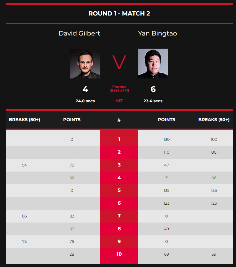 第六局,吉尔伯特率先打进长台红球左侧下方底袋,在进行下一颗黑球时失准,并将黑球停在袋口。颜丙涛获得绝佳上手机会,再次单杆破百,轰出123分,5-1率先取得赛点。