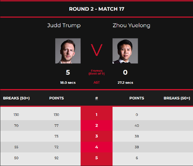 第五局,局间休息并没有让周跃龙找到任何进攻手感,他在回来之后,依旧被特鲁姆普碾压。这一局,卫冕冠军又打出单杆50分,92-6锁定胜局,总比分5-0横扫晋级,向着3连冠强势迈进!