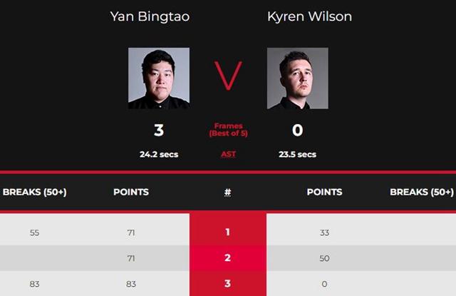 第一局,颜丙涛率先上手,建立55-0的优势,凯伦威尔逊追至33-55之后断掉,颜丙涛再次上手赢下了首局。