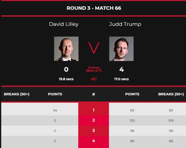 本场比赛,特鲁姆普继续保持非常火爆的进攻手感,他打出一杆破百(109分)和三杆50+(83分、96分、86分),4-0将大卫-利利横扫出局。比赛第一局,特鲁姆普一开局就迅速进入状态,他打出单杆83分,83-34先胜一局,1-0开门红。
