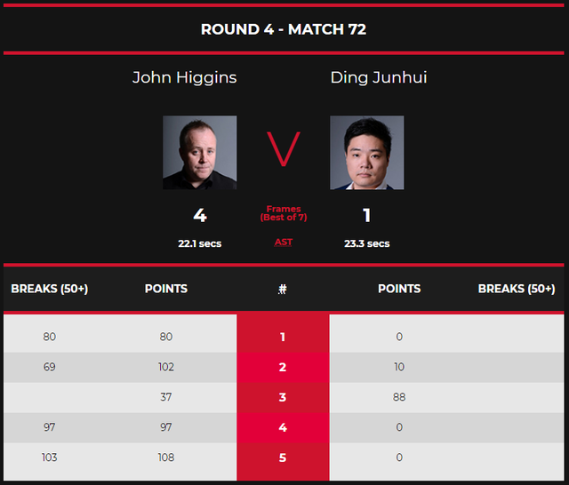 然而这场比赛的过程让人失望,希金斯一开场就展现了手感,丁俊晖一分不得,希金斯单杆80分轻松拿下首局。第二局,丁俊晖开始找到一点点状态,但希金斯还是单杆69分拿下。第三局丁俊晖抓住机会终于88-37扳回一局。然而随着希金斯再次找到手感,丁俊晖彻底成为了比赛的看客,希金斯单杆97分、103分的霸道表现再度连胜2局,丁俊晖后2局一分不得,1-4落败,打了5局结果有3局被零封。