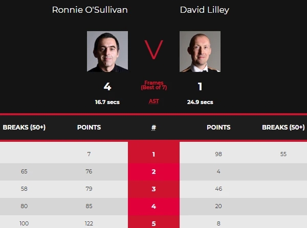 第一局,奥沙利文1分,大卫-利里单杆9分,红球不进;奥沙利文单杆6分,红球不进;大卫-利里单杆55分超6分,奥沙利文继续上手,最终大卫-利里再次拿到机会单杆34分拿下第一局。第二局,奥沙利文中袋机会上手,单杆65分,大卫-利里再次留下机会,奥沙利文单杆4分超分,大卫-利里继续上手,奥沙利文最终单杆7分拿下第二局。