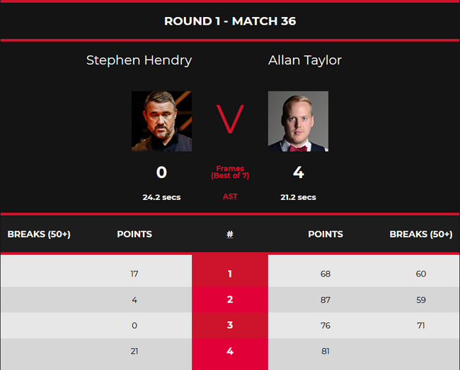 在没有中国球员的6场比赛中,赛会89号种子、“皇帝”亨德利以0-4被75号种子阿伦-泰勒横扫,无缘正赛。比赛中,亨德利表现十分糟糕,4局总共只拿到42分;而泰勒则打出3杆50+,以68(60)-17、87(59)-4、76(71)-0和81-21,大比分4-0横扫晋级正赛。