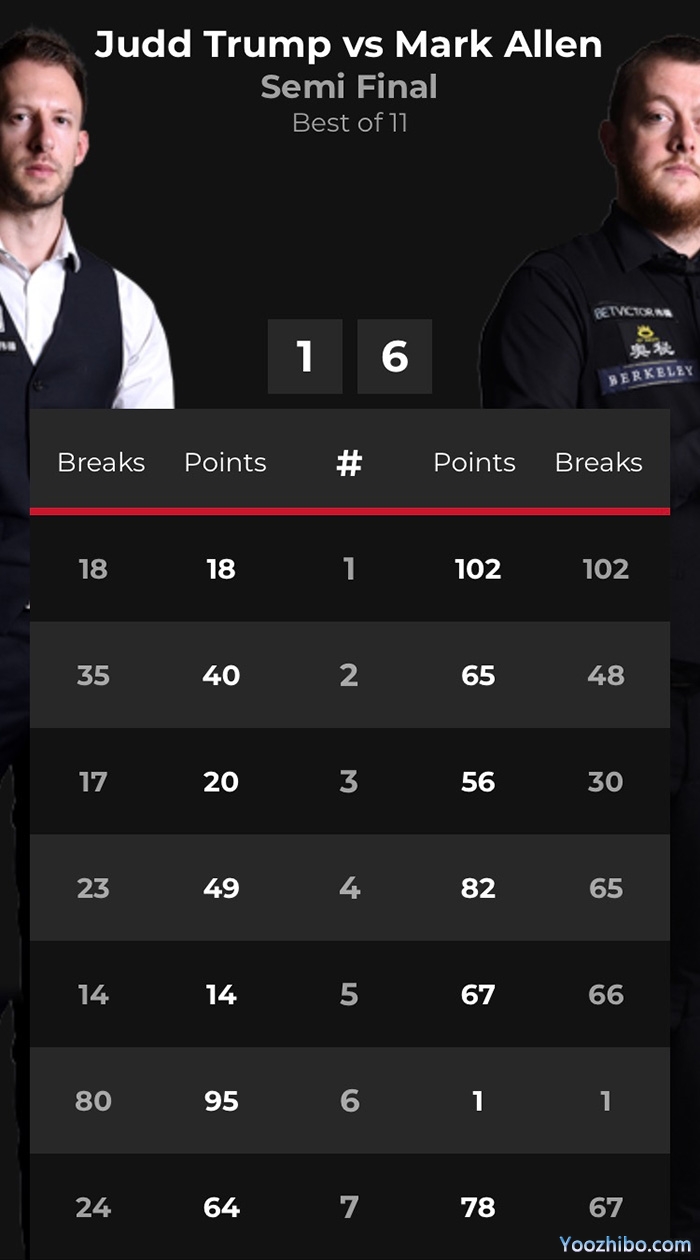 半决赛采取11局6胜的赛制,首局上来特鲁姆普先拿24分失误,艾伦上手就是一杆破百,攻下102分先拔头筹。第二局和第三局,特鲁姆普都有机会,但主动失误偏多,艾伦继续把握局面,以65-40和56-20先后取胜。第四局特鲁姆普又未能把握住制胜机会,艾伦单杆拿下65分,以82-49拿下4-0结束上半场。