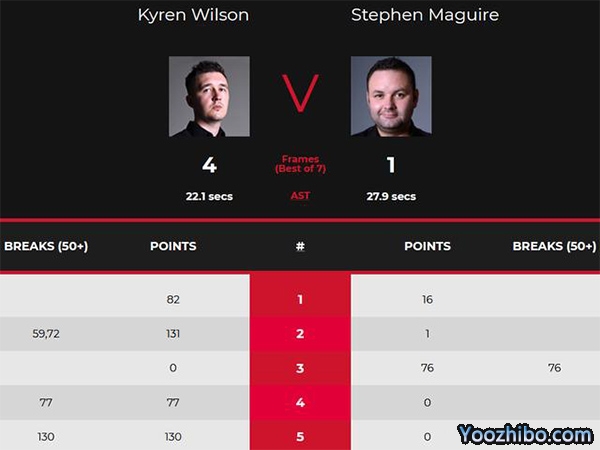纵观全场,威尔逊占据明显上风,打出一杆破百、三杆50+,而马奎尔只有一杆50+,且有两局被零封,足以说明威尔逊有多强。