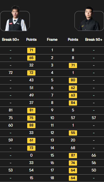 第一阶段,两人整体上的手感都不是太好,庞俊旭大比分5-4领先,其中在该阶段,曹宇鹏打出了两杆50+,庞俊旭则是未能打出单杆的高分。