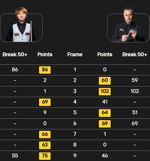 随后,伯顿手感火热,连续打出单杆 51 分和 69 分,连胜两局,以 4 比 2 率先拿到赛点。关键时刻徐思开始绝地反击,他多次上手连追两局,将比分追到 4 比 4 平,拖入决胜局。