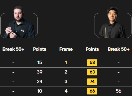 在这场比赛中,王雨晨展现出了出色的竞技状态。他全场打出一杆50+(具体为56分),并凭借稳定的发挥和精准的击球,连续赢下四局,没有给对手任何反扑的机会。四局比赛中,王雨晨的得分均超过了卡灵顿,最终以4-0的比分横扫对手,成功晋级96强。