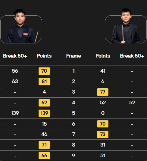 比赛前期范争一状态出色,很快进入状态,凭借精湛的球技和稳定的发挥,建立起领先优势。他打出了一杆 139 分的破百以及两杆 50+,以 4-1 领先龙泽煌。这显示出范争一在进攻端的强大火力和对局面的良好掌控能力,给龙泽煌带来了巨大的压力。