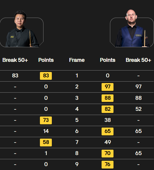 首局:周跃龙以单杆83分的出色表现先下一城,取得1-0的领先。