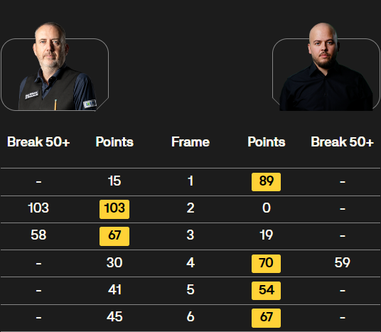 威廉姆斯率先打进红球并选择防守。布雷切尔在解球时失误被罚4分。
