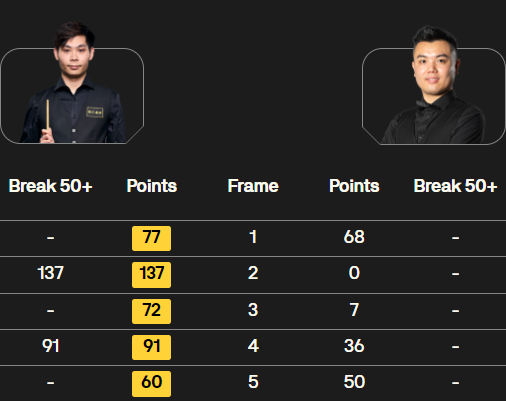 第四局:贺国强乘胜追击,轰出单杆 91 分,以 91-36 再下一城,大比分 4-0 领先,手握赛点。