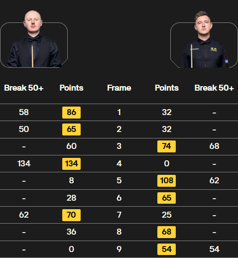 第二局:麦克吉尔再次发威,单杆50分,以65:32再胜一局,将比分扩大为2-0。