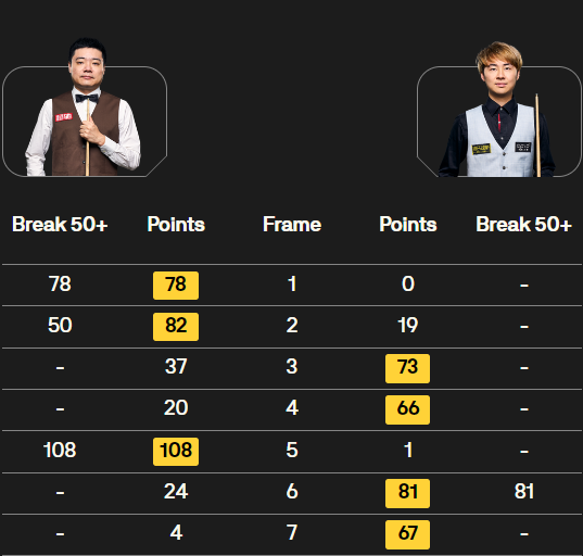 丁俊晖在第六局中表现出色,打出单杆69分,以69-0将比分扳平为3-3。