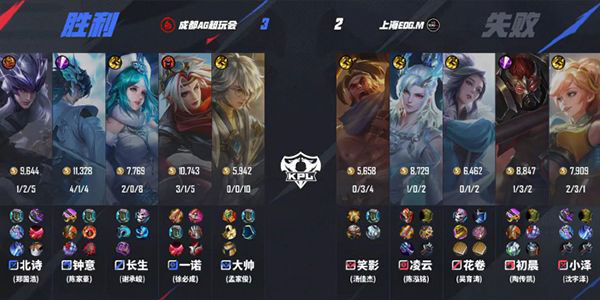第二局,前期双发多有摩擦,八分钟AG抓住机会完成团战0换3!十分钟拿下暴君后连拆两座高地,经济差来到6K。钟意元坦多次关键开团成功帮助队友拿下小局胜利!AG扳回一局!本局MVP为成都AG_钟意 (陈家豪)元流之子!