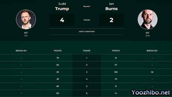 北京时间10月26日,2023斯诺克北爱尔兰公开赛第3轮中,特鲁姆普对阵伊恩-伯恩斯,特鲁姆普以76-15、65-57、20-128、39-69、69-8、80-14,总比分4-2击败对手伊恩-伯恩斯,顺利晋级下轮!