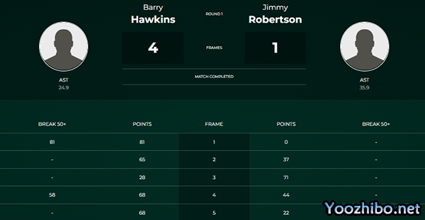 北京时间10月26日,2023斯诺克北爱尔兰公开赛第3轮中,巴里-霍金斯对阵吉米-罗伯逊,巴里-霍金斯凭借单杆打出81分和58分,总比分4-1击败对手吉米-罗伯逊,晋级下轮。