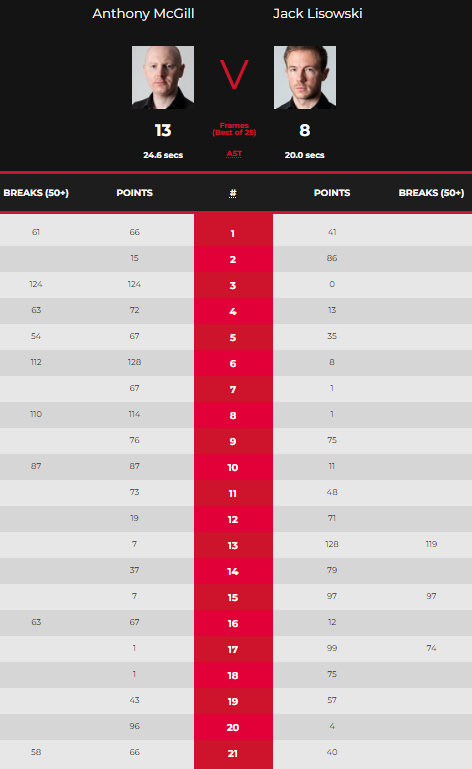 在首局比赛中,麦克吉尔一上来就凭借单杆打出61分的表现以66:41拿下此局比赛的胜利成功取得1-0的领先拔得头筹。第2局,利索夫斯基凭借多次上手的机会成功拿到了86分并以86:15拿下此局比赛的胜利从而以1-1战平了麦克吉尔。第3局,麦克吉尔终于打出非常火热的竞技状态,单杆轰出124分零封利索夫斯基取得2-1的领先。第4局,麦克吉尔单杆打出63分的表现以72:13拿下此局比赛胜利3-1领先利索夫斯基。