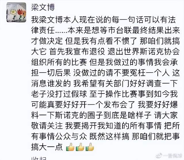 其实,梁文博本人也早已经破罐子破摔。此前,网络上流传了一张梁文博的朋友圈截图,截图中梁文博表示自己宣布退役,并且表示自己要揭开斯诺克圈子的黑料,把事情搞大。目前,梁文博已经没有在英国,而是来到了香港,传言称他还要开台球馆。但如此声名狼藉,很难想象还会有人把孩子送到他的台球馆打球训练。