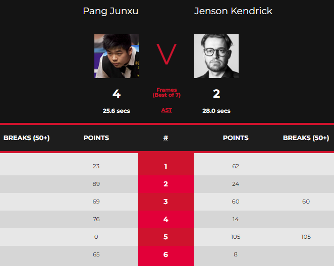 北京时间3月16日,2023斯诺克WST经典赛第1轮,庞俊旭对阵简森-肯德里克中,最终庞俊旭以大比分4-2击败对手简森-肯德里克,晋级第二轮。