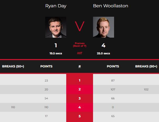 威尔士名将瑞恩-戴则是成了当日出局的世界排名最高的选手。在与本-沃拉斯顿的比赛中,前3局,瑞恩-戴打得并不好,以23-87、20-107(102)和54-66连丢3局,大比分0-3送出赛点。第四局,他终于找到手感,轰出单杆110分,以110(110)-0挽救1个赛点。但第五局,本-沃拉斯顿通过多次上手,再次以65-17获胜,大比分4-1晋级正赛。