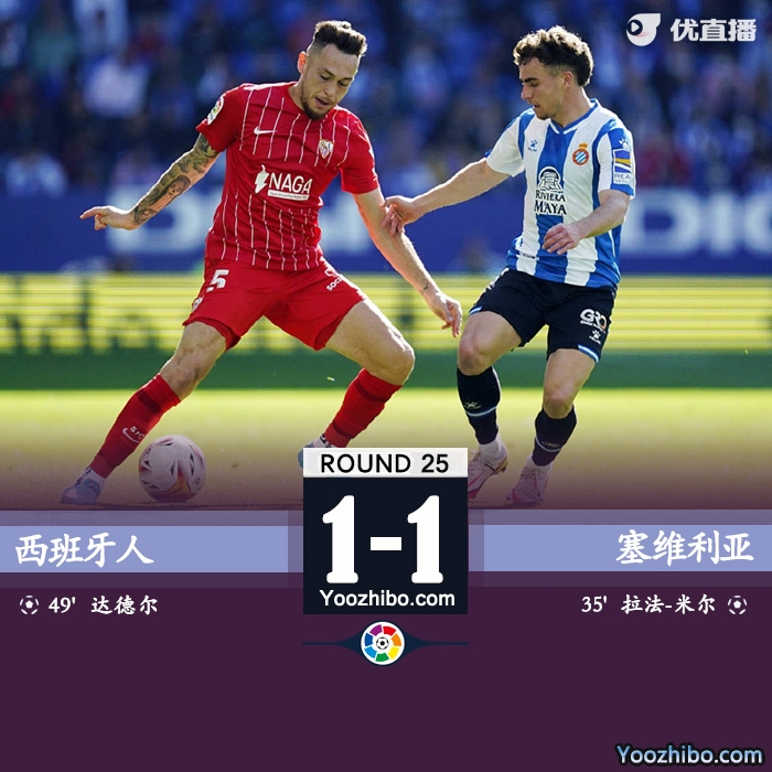 24直播网2月20日讯 北京时间2月20日晚21:00,西甲第25轮比赛继续进行,西班牙人坐镇主场迎战塞维利亚。上半场,拉法-米尔破门,马夏尔伤退;下半场,达德尔头槌扳平,孔德染红 ,武磊替补未登场。最终,西班牙主场1-1战平十人塞维利亚,遭遇联赛6轮不胜,塞维利亚距离榜首的皇马6分。