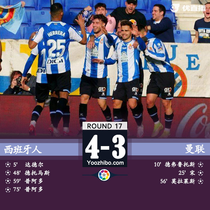 24直播网12月11日讯 北京时间12月11日21:00,西甲第17轮,西班牙人主场迎战莱万特。上半场,达德尔贴地斩打入赛季首球,德弗鲁托斯扳平比分后助攻宋反超;下半场,德托马斯开场立即扳平,德弗鲁托斯助攻莫拉莱斯破门,普阿多双响超出比分,武磊未能获得出场机会。最终经过一场进球大战,西班牙人4-3击败莱万特。