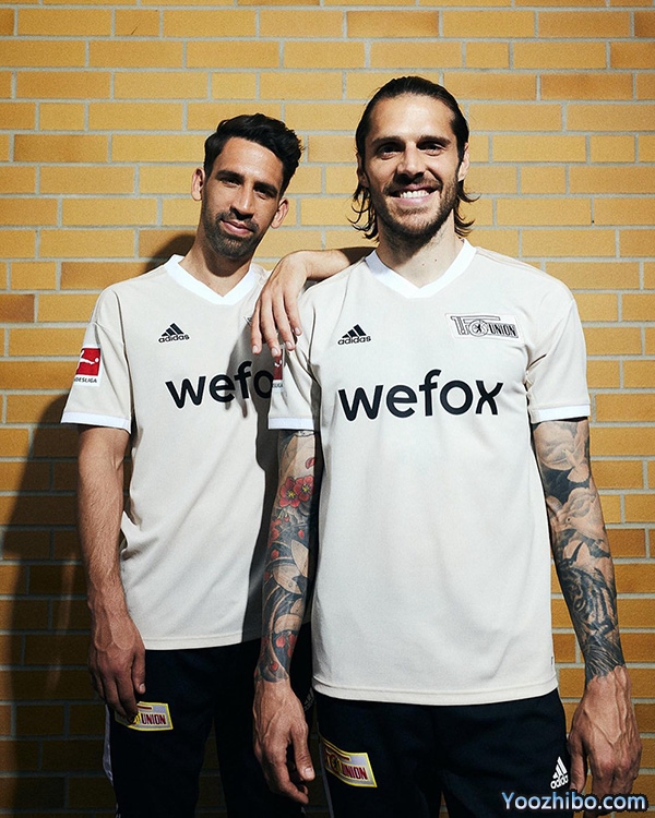 2022-23赛季柏林联合客场球衣搭配带有沙色阿迪达斯胜利三条纹的白色球裤与球袜。