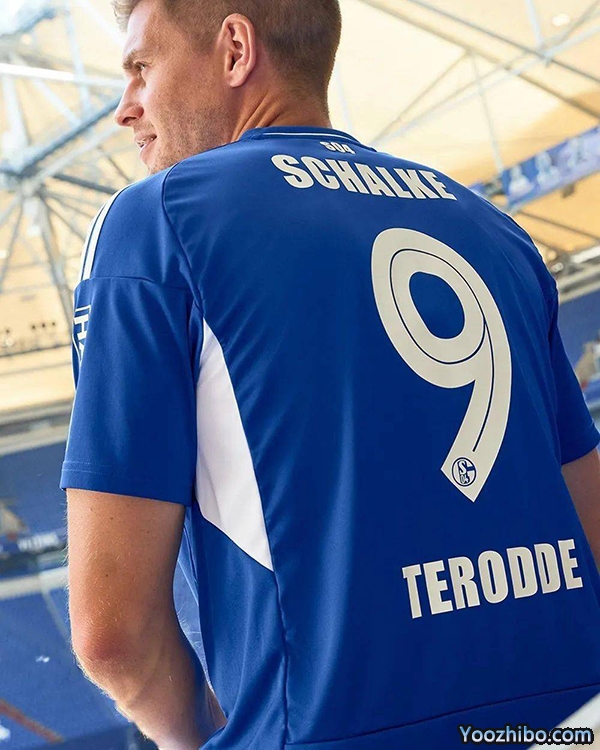 沙尔克04新赛季主场球衣搭配带有皇家蓝色阿迪达斯胜利三条纹与刺绣标志的白色球裤以及皇家蓝色球袜。