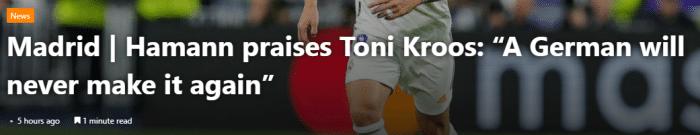 24直播网05月31日讯 消息,前德国国脚哈曼盛赞克罗斯比肩贝肯鲍尔,而且不会有德国人再取得他的成就。