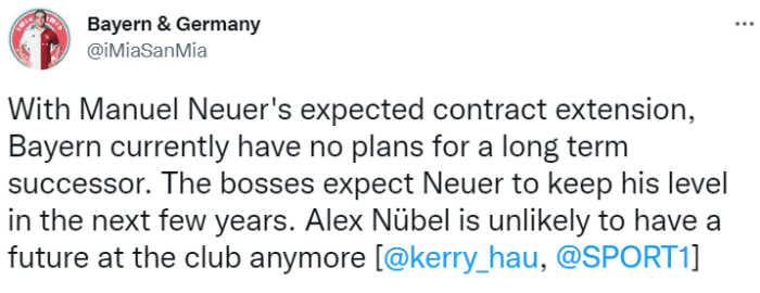 该记者表示,诺伊尔预计将很快与拜仁续约,尽管他在今年就要年满36岁,但拜仁高层认为未来几年他还会保持高水平,因此没有对他接班人这是有长远考虑,这也意味着努贝尔在拜仁失去了未来。