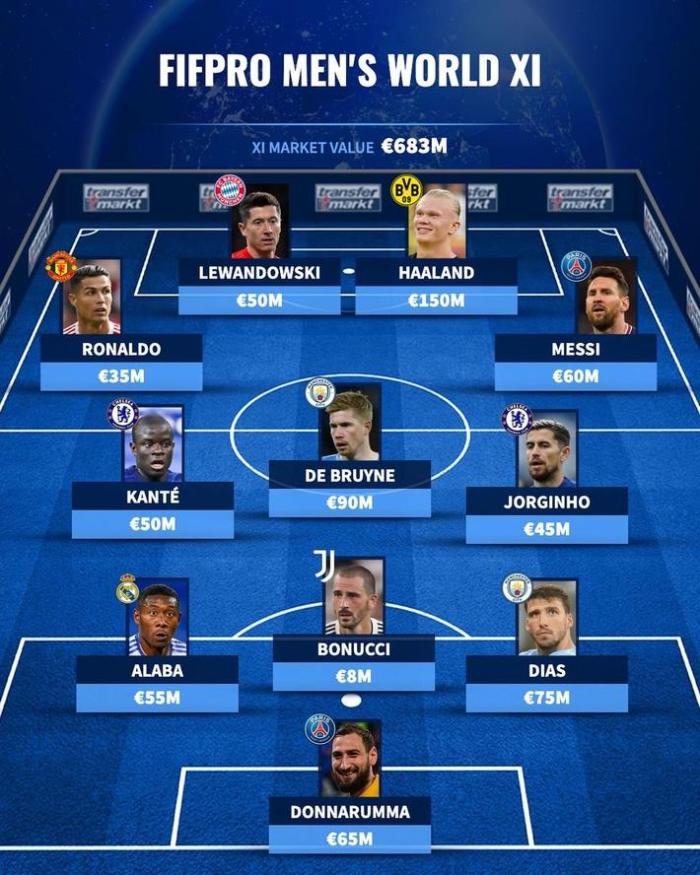24直播网01月19日讯 ,国际足联公布了年度最佳球员阵容,德国足球转会市场也统计了球员们的身价,哈兰德1.5亿欧元领衔,整份榜单身价高达6.83亿欧元。