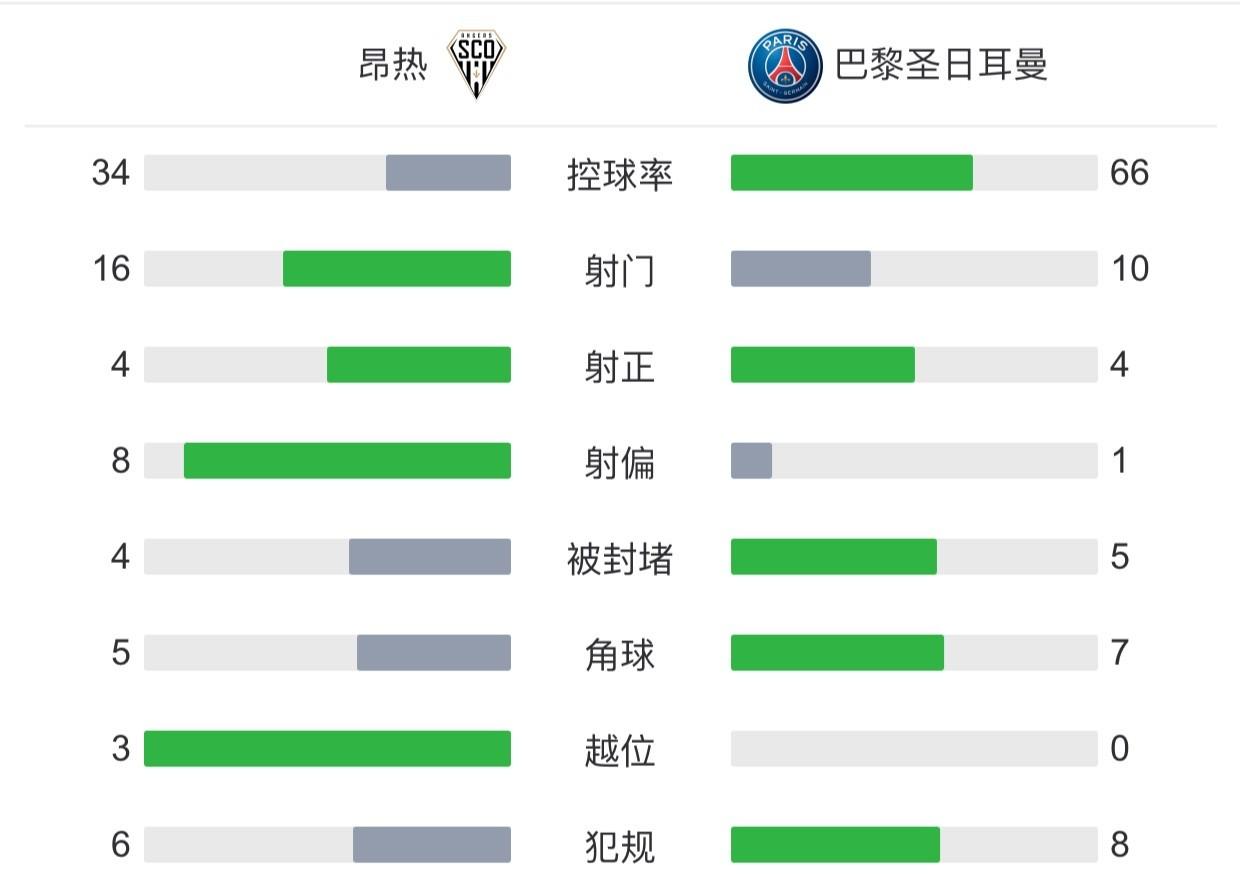 最终巴黎圣日耳曼2-1击败昂热,多赛1场11分优势领跑积分榜。