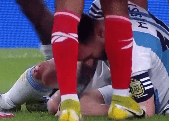 梅西遭对手双人飞铲膝盖被踢出血!阿根廷众将暴怒上前理论