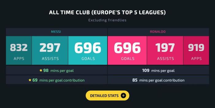打进这粒进球后,梅西效力五大联赛期间的俱乐部进球数已经达到696粒,正式追平C罗的纪录。