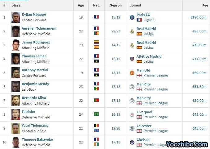 摩纳哥队史卖人排行:姆巴佩1.8亿欧居首