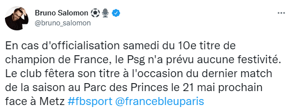 24直播网04月23日讯 记者BrunoSalomon消息,虽然巴黎本轮打平就能夺取联赛冠军,但他们没有准备任何庆祝活动。