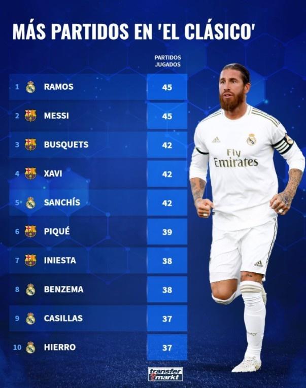 拉莫斯和梅西以45场并列第一,布斯克茨、哈维和桑奇斯都是42场。目前拉莫斯和梅西都效力于巴黎圣日耳曼。