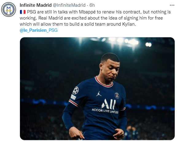 皇马希望在今夏免费签下姆巴佩,并且围绕他建队。巴黎还在和姆巴佩谈续约,但没有达成协议。