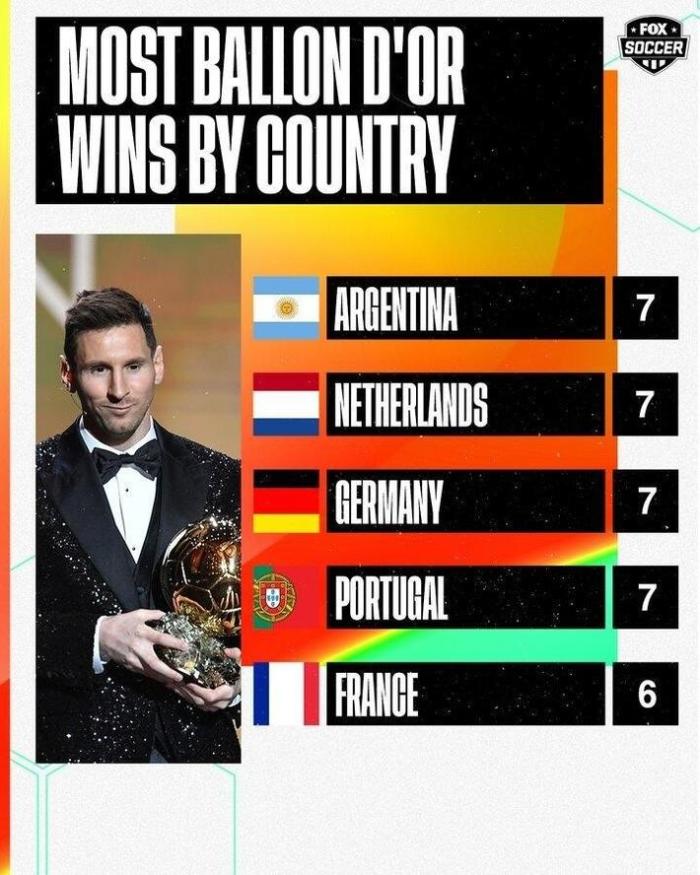 来源:24直播网11-30 16:4424直播网讯 今天,梅西夺得个人生涯第7座金球奖,现在阿根廷的金球奖数量已经追平德国、荷兰和葡萄牙,并列第一。