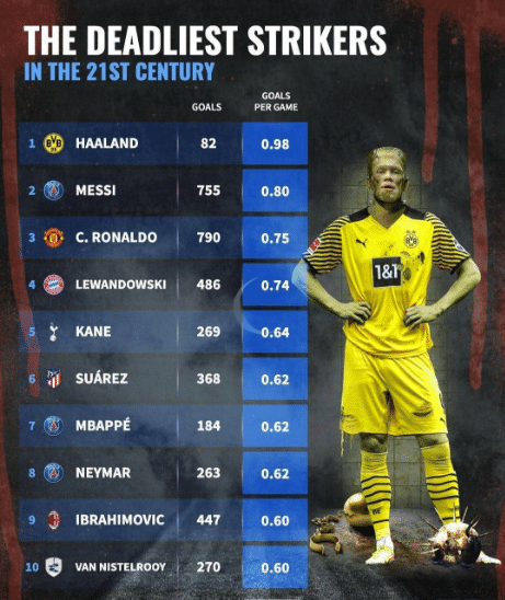 如图,哈兰德的效率非常高,他出道之后,场均进球高达0.98球,而排名第二的梅西,只有场均0.8球的效率,而梅西的老对手C罗,场均只有0.75球。排名第四的是莱万,场均0.74球和C罗差距不大。第五是场均0.64球的凯恩,第六是场均0.62球的苏亚雷斯,第七是场均0.62球的姆巴佩,第八是场均0.62球的内马尔,第九是场均0.6球的伊布,第十是场均0.6球的范尼。