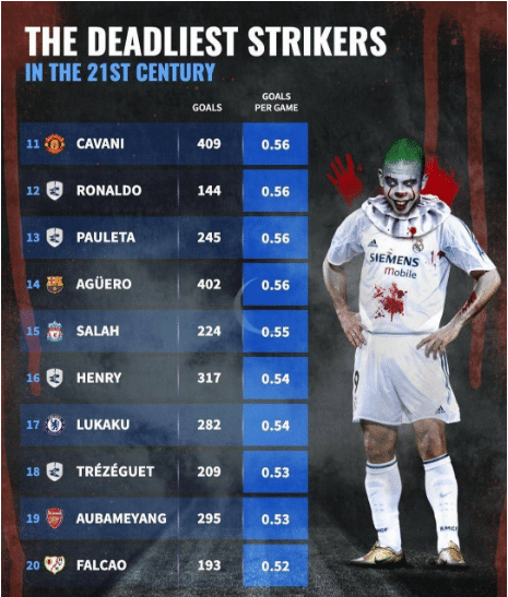 本世纪足坛场均进球效率榜:梅西第二,C罗第三,第一是谁?