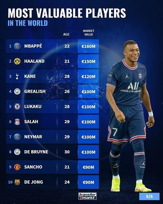 足坛球员身价排行:姆巴佩哈兰德前二,凯恩第三