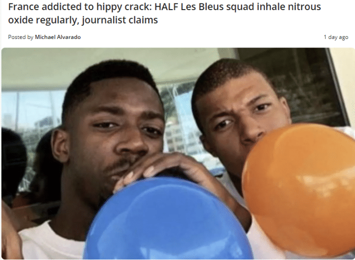 该记者在油管视频中爆料,法国队一半的球员定期吸食笑气,法国足球联赛中75%的球员吸食这种有争议的气体。