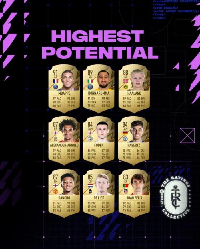 FIFA22球员潜力排行:姆巴佩、哈兰德前三